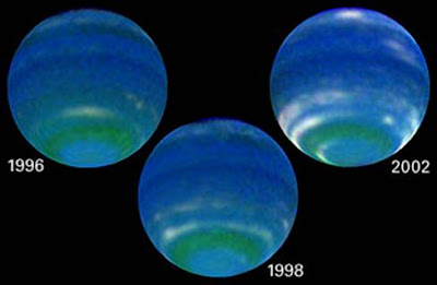 [注:Atmospheric brightness increases on Neptune, 1996-2002. (Sromovsky et al. / NASA / HST)]