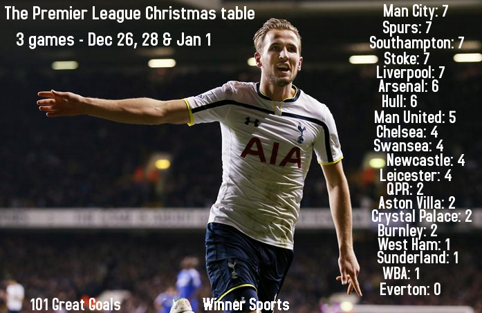 很显然,在刚过去的这个圣诞赛程里,最大的赢家是曼城、热刺、南安普顿、利物浦和斯托克城5支球队。虽然面对如此疯狂的赛程,他们都未能拿满9分,但7分的成绩已经足够出色。