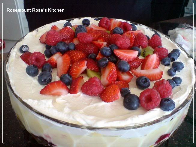 然后就top up custard,然后上面就用打好的cream盖住……再用水果来布置。