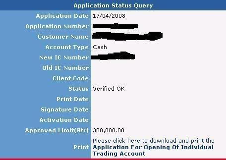 In order for us to process your application, please print out the Application For Opening Of Individual Trading Account Form and return the signed document along with a copy of your I/C to the following address. If you are unemployed or a retiree, kindly attach your latest 3 months bank statement as well.