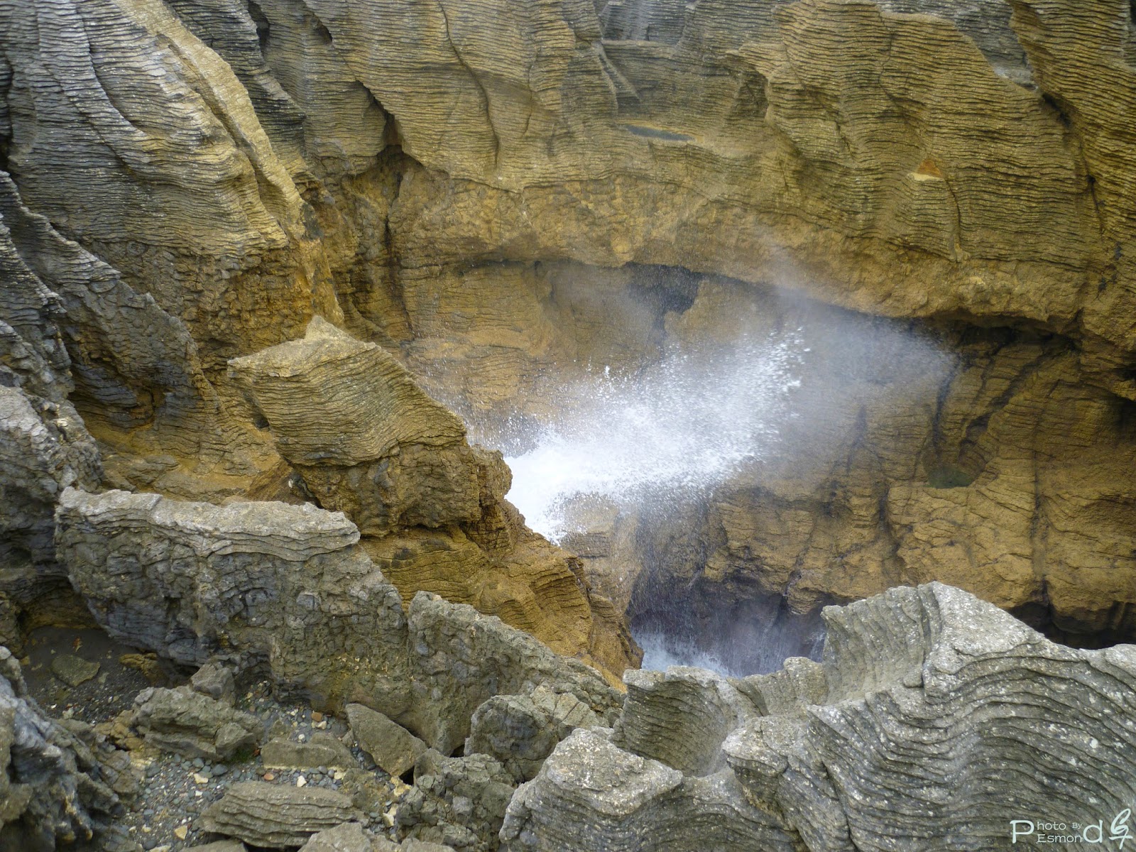 Punakaiki是一个位于Westport和Greymouth之间的旅游景点。这个景点是以这些看起来很多层的石头闻名。除了这些一层层的石头,这里还有一个很有卖点的特色,那就是Blowholes啦!!!Blowholes就是当海浪涌入合适的洞穴内,造成洞穴内的压力增加而形成的海水喷发。Punakaiki这里也有数个Blowholes,但是每天也只有遇上当天的涨潮才可以形成,所以可不是每次来都可以看到哦!!!