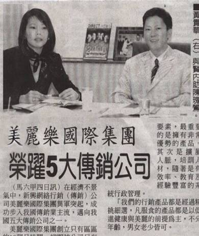 一、2002年直營傳銷開始,2003年創造1億2000萬馬幣(相當於12億台幣營業額)進入馬來西亞第五大傳銷公司,打破馬來西亞28年來傳銷公司記錄。