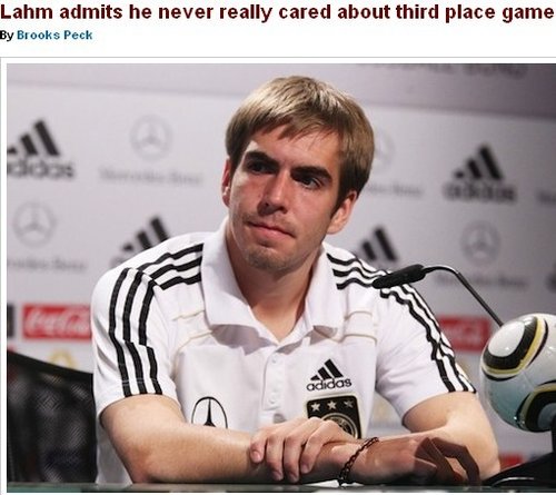 接着拉姆又回忆起2006年世界杯德国战胜葡萄牙一战。“四年前,我们意识到比赛原来可以踢得那么好。在以前,老实说三四名决赛人们只有一点兴趣,而我还是小孩子的时候根本不会去看一眼。但毕竟在世界杯快结束的时候获得一场胜利也算是个安慰。国际足联既然组织了这场比赛,换成是你也想赢得铜牌。”