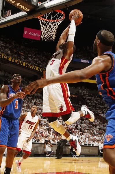韦德的第一次出手未能得分,但是很快他就成为了球队扭转落后的关键,先是一次近距离跳投得分,接着他在防守端协防时从后方封盖了安东尼,随后就是偷下,接到查莫斯助攻轻松得分,并打成2+1,在帮助热火9-6反超之后,韦德此后又有一次底线切入之后接到波什助攻反身暴扣的精彩表现——一人连得7分之后,热火11-6领先。这样的表现显然还不足够,很快韦德又在底角面对菲尔兹防守时上演了一次高难度后仰跳投得分,半分钟之后,他又在切入时接到詹姆斯助攻轻松上篮得分——短短的7分半钟,韦德便拿下了全队15分中的11分。首节韦德仅打了8分钟便有6投5中得到11分的贡献。