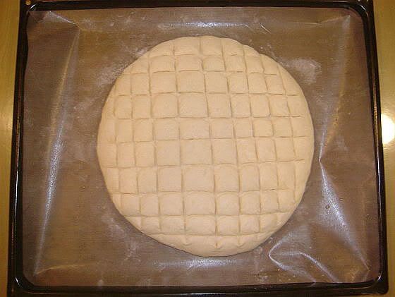 5. 發酵30分鐘後.在麵糰表面.以刀子畫出切痕.。