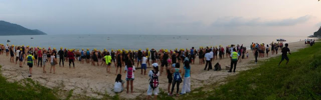 大概7点之后就各自去热身,准备第一项 – 游泳1.5Km在还没有开始之前,很多选手都先试着游先,那时看到的情形是浪很大拼命游也只是游到那一点点距离