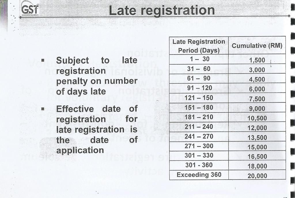 Late Registration Penalty 改了,提高很多了。在 23/04/2014 之前上课或有买 GST 书本的人要注意,因为他们手上拿到的书或Notes,可能是还没有改的,现在的 Late Register Penalty 提高到 RM1,500 to 20,000 不是之前所讲的 RM200 to RM 6500.
