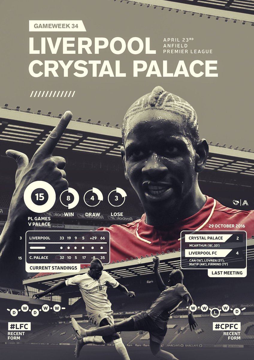 4月23日晚23点30分,2016-17赛季英超第34轮,利物浦坐镇安菲尔德球场迎战水晶宫。