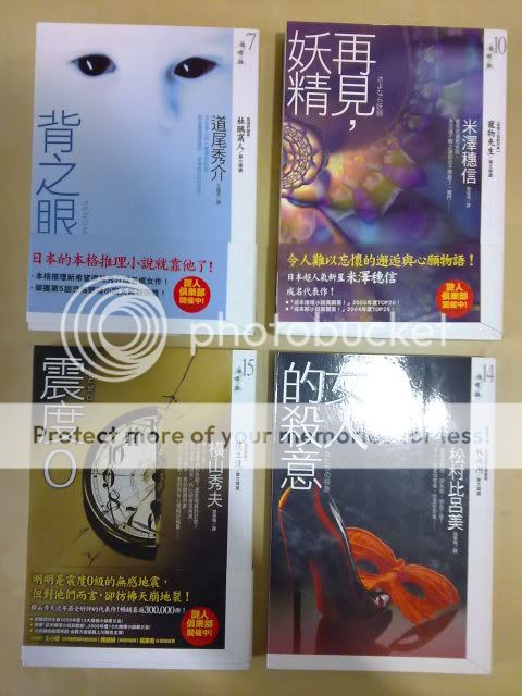 之後只好轉換跑道,去30%找那種在書單上面的書,看到一整排皇冠推理迷系列,讓我興奮了一下,但仔細一看,竟然沒有我最想買的那本《儞勒之掌》!!悶掉...但看了一看還是有我要買的《震度0》,《背之眼》,就直接掃進去了,然後看看《再見,妖精》就拿着走了很久,最後想想,try看他的青春推理也好(我只買了米澤穗信的《算計》,絕對不屬於青春推理)...走着走着,在一個不可能的地方看到《女人的殺意》,看了一下,覺得ok,而且相比這系列的其他書,是比較便宜的,所以就買了...《凴神》是想買了很久的書,就直接掃下來了,沒想太多...本來是還有看到幾本想買的,但斟酌了之後,還是放棄了,以後想看再買,加上這次書展有給voucher,我剛好可以拿兩張,ngam ngam就好了...不要浪費...放棄了《少年pi的奇幻冒險》,《...樹偵探》不記得名了...,《天國五裏路》,陰陽師的4,5(不想買來屯貨)...