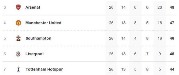 然而仅仅一轮之后,积分榜就发生重大变化:阿森纳战胜水晶宫后,已从第5飙升至第3(48分),而曼联在不敌斯旺西之后已跌至第4(47分);利物浦击败南安普敦后,已悄然上升至第6位(45分),与排名第5的圣徒(46分)只有1分之差;热刺在被西汉姆联2-2逼平后,已滑落到第7(44分),这场平局的唯一“好处”是铁锤帮没有取胜,否则阿勒代斯的球队也将达到41分。本轮战罢之后,第3与第7之间的积分差距已经缩小到4分!