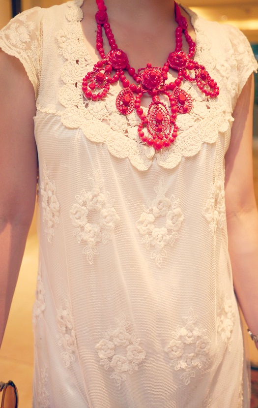 lz的红色大项链成了你身上的焦点,和蕾丝裙很搭哦。