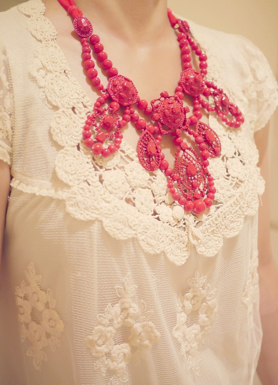 lz的红色大项链成了你身上的焦点,和蕾丝裙很搭哦。 |