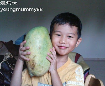 哇。。。。那粒芒果是大粒的咯!比你儿子的脸还大哦 |