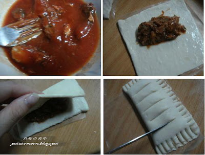 3。然后用叉子压紧边缘,用刀子在上面割几刀