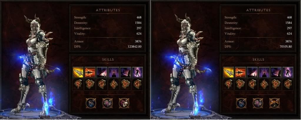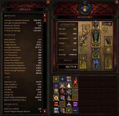 当然pump dex,crit dmg和chance的后果就是低armo,低resist,在inferno很豆腐,只适合有tanker的情况下。solo就换加AR和armo的装,dps少10k不过没有酱豆腐还能顶一下。 |