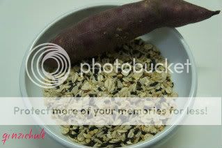 5oz番薯五谷米糊(有机糙米、红米、黑米、小米、荞麦、燕麦片) + 有机南瓜馒头 + 有机芋头馒头(自制)