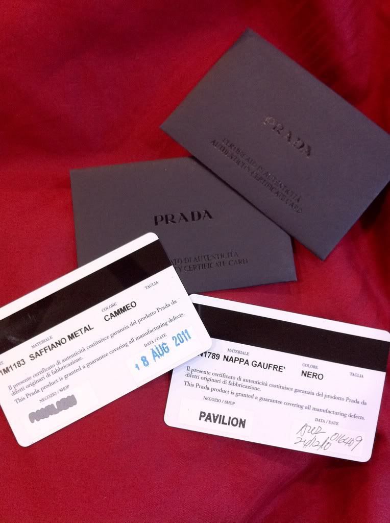 Miu Miu的只有一张保养卡之类的小卡而已。。但是如果你仔细找的话,你会看到它的内袋是有号码的和写着"made in Italy" |