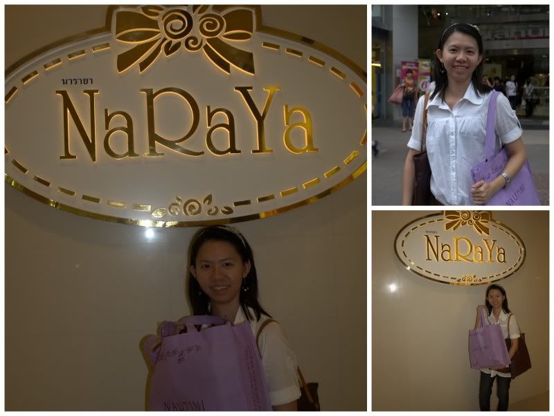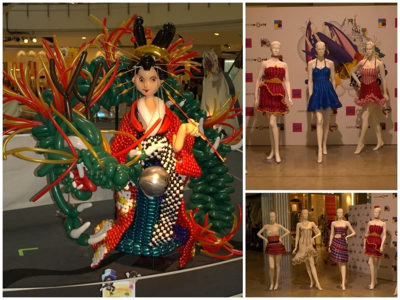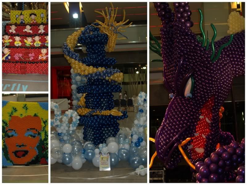 拜完四面佛,下一个目的地就是会让所有女性失控的NaRaYa包包店,就在底楼Starbucks的对面,蛮容易找地。。。还没走进去,就已经看到店内人山人海,用这句话来形容真的是一点都不夸张。。。 我在里头逗留了大概45分钟吧,先把所有的包包都看了一遍,才去把要的包包找出来,然后再进行一轮的淘汰赛,最后付钱时只花了大约1500++B,这才提着满满一袋的包包带着满足感离开。。。 看到那些香港人的蓝里都装得满满地,比我的还要多很多呢。。。 过后我们就在里头随便乱逛,铭把我带到汽球展览处,只见这里有着许多用汽球做成各式各样的服装、模型。。。原来之前我在疯狂扫货时,铭已在这里转了一圈,拍了一些照片。。。