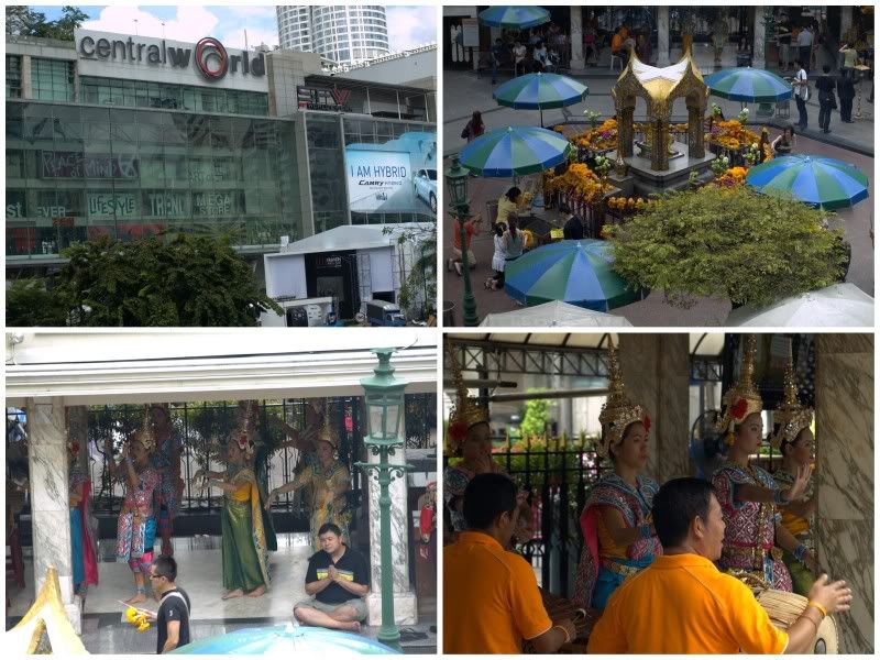 第二天的行程还是以购物为主,当然不会忘了要到central World Plaza附近的四面佛。在旅馆吃了早餐后就搭BTS到Chit Lom下车,在天桥上就可以看到四面佛已挤满人潮,好不热闹!原来四面佛那么容易找,之前只知道是在Central World Plaza斜对面,还以为要到处乱逛才可以抵达。。。 到了四面佛就直接进去买花、蜡烛等用品,因为之前在网上看到有人说外面的档口会较贵。。。走到档口前看到大大小小地花串,也不知该选那一种,就胡乱对口操广东话的档主说100B的要两份,还蛮大份地。。。 付钱拿了东西赶紧闪到一边去稍微整理一下盘里的花,顺便观察人们怎么拜。。。 我自己拜到有点手忙脚乱,只因花串太长了,缠在一起,一只手捧着盘,只有单手可以把交缠的花串分开,着实有点狼狈。。。 我拜完后坐在一边等候铭时才发现还有更小串的花在卖。。。我们买的算是中地。。。