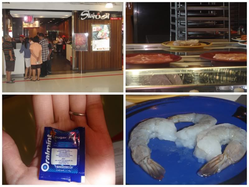 午餐就去了在网上看到的Shabushi吃火锅寿司自由餐,就在Siam Center里头,从Central World Plaza走去Sian center很近,大约5 - 10分钟就可以到了,走在天桥上就可以看到Shabushi位于最高的那楼。一个人收费229B,规定只有1小时15分钟可以享用,超时会罚款。到了那边一看,果然名不虚传,好多人在门口徘徊等待。排队拿了号码,我们就在附近的店面逛逛,还好不必等太久就轮到我们了。店里头就和我们这里的Sushi