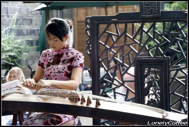 不用进餐馆里,在门外就能看到的美女,站着听那优美的琴声已经很有feel了,如果进去里面坐下喝杯茶听的话,相信更好