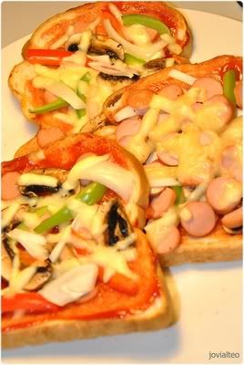 呵呵,很简单~你只需要涂上意大利面番茄酱或普通的辣椒酱/番茄酱,然后放上你喜欢的料,加上mozeralla cheese,放入烤炉(烤炉要预热先哦),大概10分钟就可以吧~(200‘c)  |
