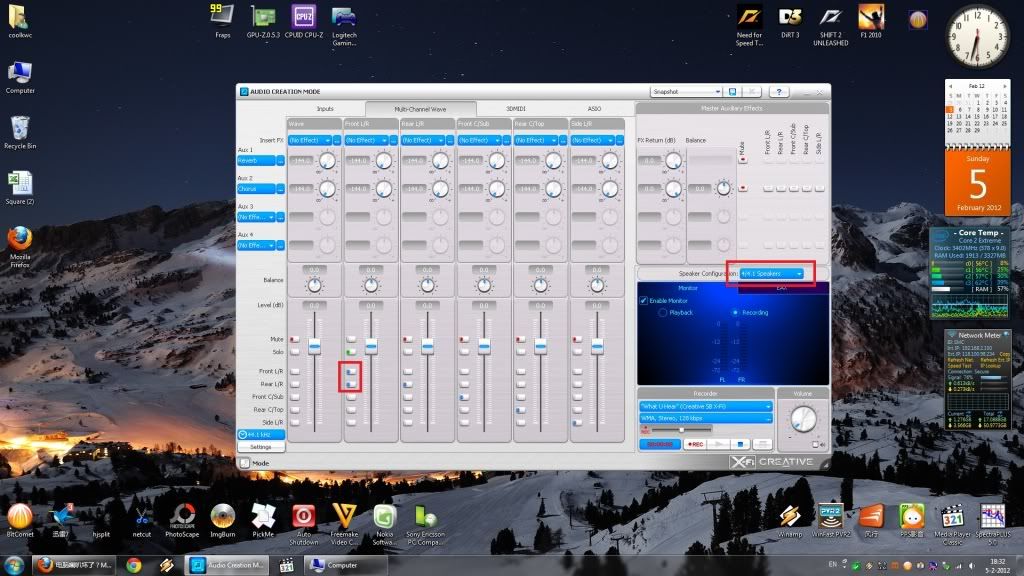要先把sound card换成sound creation mode(只有X-Fi有酱的功能),然后enable 4/4.1,然后把Front L/R同时clone去Front L/R和Rear L/R。