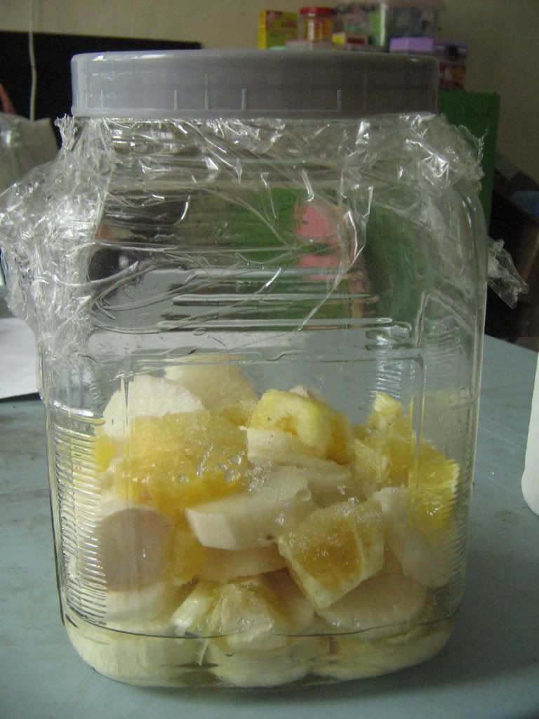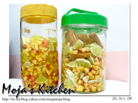 我用了1粒檸檬 , 2粒黃梨, 3粒橙 和 1包半的赤糖做了第一次的酵素.
