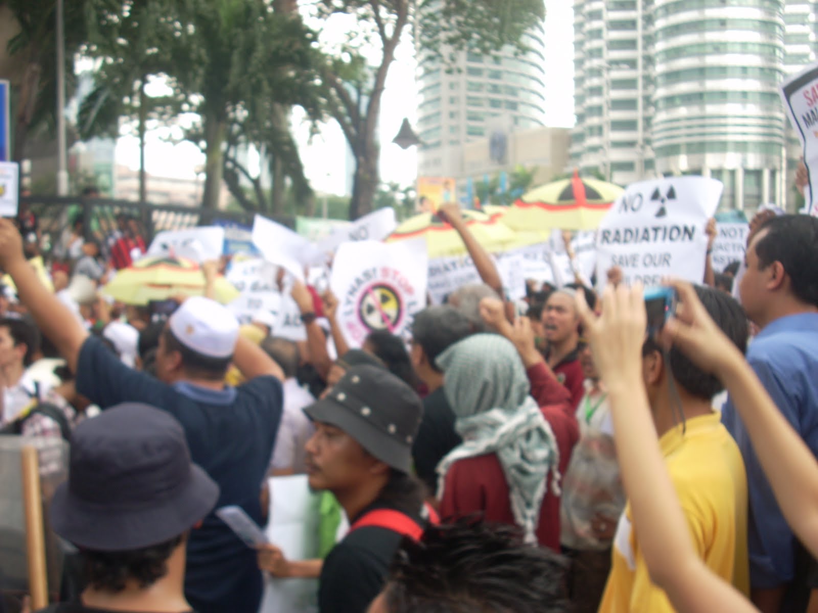 KUALA LUMPUR, [size=85%]20 Mei - Ratusan orang berhimpun bagi membantah pembinaan pusat pemprosesan nadir bumi bernilai RM700 juta di Gebeng, Kuantan yang dimiliki syarikat Lynas yang berpengkalan di Australia. Mereka yang terdiri daripada anggota Pemuda PAS, PKR, Parti Sosialis Malaysia (PSM), NGO dan aktivis sosial itu mengadakan perhimpunan di hadapan Pesuruhjaya Tinggi Australia di Kuala Lumpur. Sambil mengiringi enam wakil mereka untuk menghantar memorandum bantahan berhubung pembinaan pusat itu yang dikatakan akan mengeluarkan bahan radioaktif yang boleh menjejaskan kesihatan penduduk sekitar Gebeng di negeri itu. Mereka juga membawa pelbagai sepanduk, poster dan kain rentang yang menuntut kerajaan supaya segera menghentikan projek berkenaan. Ia antaranya bertulis "Selamatkan Bumi, Hapuskan Radiasi" dan "Katakan tidak Pada Radiasi! Hentikan Lynas!". Penunjuk perasaan mula berkumpul di Masjid As Syakirin KLCC sebelum berarak menuju ke Pejabat Pesuruhjaya Tinggi Australia yang terletak kira-kira 700 meter dari selepas solat Jumaat. Sewaktu tiba di pada jam 2.15 petang mereka turut melaungkan "Hancur Lynas, Hidup Rakyat" berulang kali. Mereka kemudiannya disertai oleh ahli parlimen Kuantan, Fuziah Salleh, empat wakil NGO dan aktivis sosial sebelum memasuki perkarangan pejabat tersebut. Turut hadir ketua Pemuda PAS Nasrudin Hassan, Naib Presiden PKR, Tian Chua, Naib Ketua AMK PKR Azmizam Zamanhuri, Setiausaha Agung PSM S Arutchelvan dan exco Kerajaan Selangor Rodziah Ismail dan Elizabeth Wong. Sejurus mereka masuk, hujan turun dengan lebatnya, tetapi penyokong anti-Lynas tidak berganjak dan terus berhimpun sambil menyanyikan 'Suara Rakyat' dan bertakbir.
