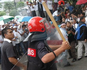 [Namun, anehnya senario yang jauh berbeza dengan apa yang berlaku dalam demontrasi yang dijalankan oleh pihak yang menyokong kerajaan. Buktinya, dalam masa yang sama sebuah NGO yang menyokong kerajaan iaitu Perkasa turut mengadakan demontrasi menyokong akhbar Utusan Malaysia di hadapan pejabat akhbar terbabit di Jalan Chan Sow Lin. Difahamkan himpunan mereka yang turut melibatkan beberapa orang ahli UMNO itu hanya dikawal oleh beberapa orang anggota polis sahaja. Itu pun mereka berkawal dari jarak yang jauh kerana mendapat maklumat Angkatan Muda Keadilan juga akan mengadakan demontrasi di pejabat Utusan pada masa itu. Namun, AMK mengubah jadual mereka untuk bersama rakyat di demontrasi Lynas pada hari tersebut. Difahamkan, himpunan anjuran Perkasa dan UMNO itu yang dilihat bermotifkan politik dikawal oleh pihak polis dengan begitu tertib sekali. Tiada FRU dan tiada senjata api berbahaya yang dipamerkan kepada peserta terbabut. Ini jauh sekali berbeza dengan apa yang berlaku di himpunan Lynas. Soalnya sekarang, kenapa polis boleh berhemah kepada sebelah pihak sebaliknya begitu ganas terhadap pihak yang lain?. Bukankah semuanya itu adalah rakyat Malaysia. Polis bekerja untuk siapa sebenarnya?. Untuk rakyat Malaysia atau untuk Kerajaan UMNO Barisan Nasional?. Inilah yang menjadi persoalan sejak sekian lama. Oleh itu, ubahlah sebelum jadi parah].