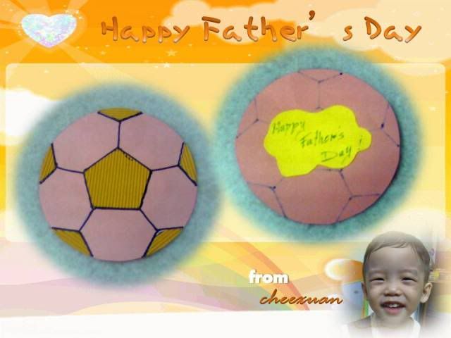 阿轩懂事了,你一提到father's day他就可以想到他school bag的卡片。他爸爸开心吗?我看到卡片上有ball,轩爸有看world cup吗?阿涵爸今早的2.30am还可以起身来看巴西赛,我服了他。