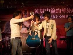 除了自己的新專輯外,身為美國吉他品牌“Ovation”的首位華人代言人的黃貫中還帶來了一把刻有自己的名字的“Ovation”吉他,並在現場把吉他贈送與他一起合唱的搖滾新軍“AOK樂隊”。