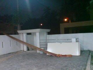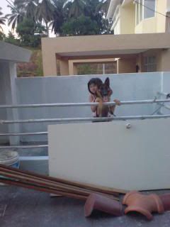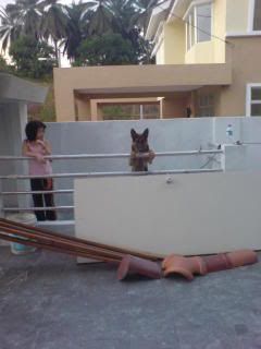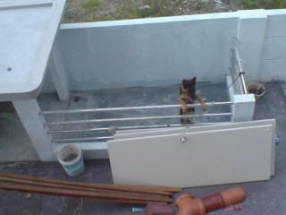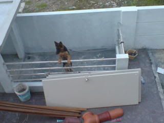 铁条的,现在只好把他们关在花园里因为花园的墙壁很高,加一个铁门解决问题,还有空间给他们跑动。 |