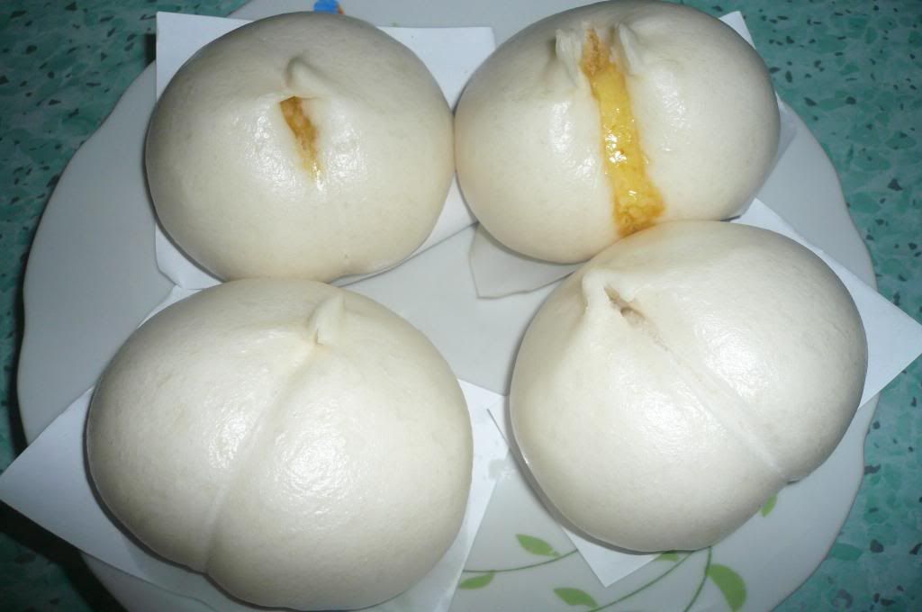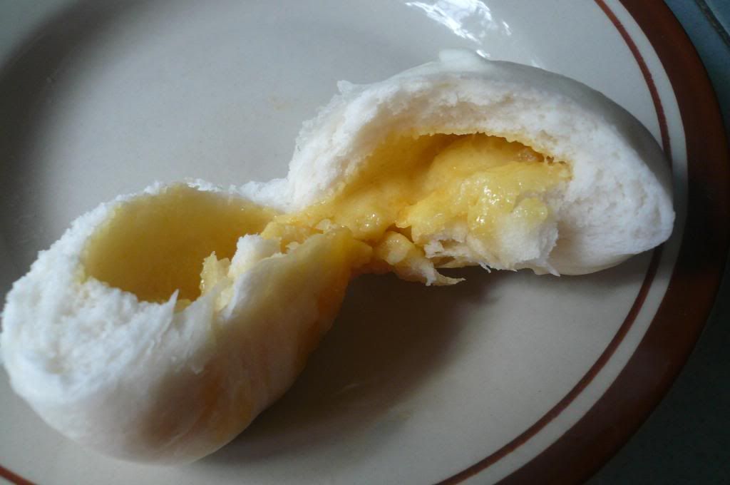 看黄色的蛋黄牛油馅,那流出来的部份已被吃掉,这包子要热热吃才会有流沙噢! |