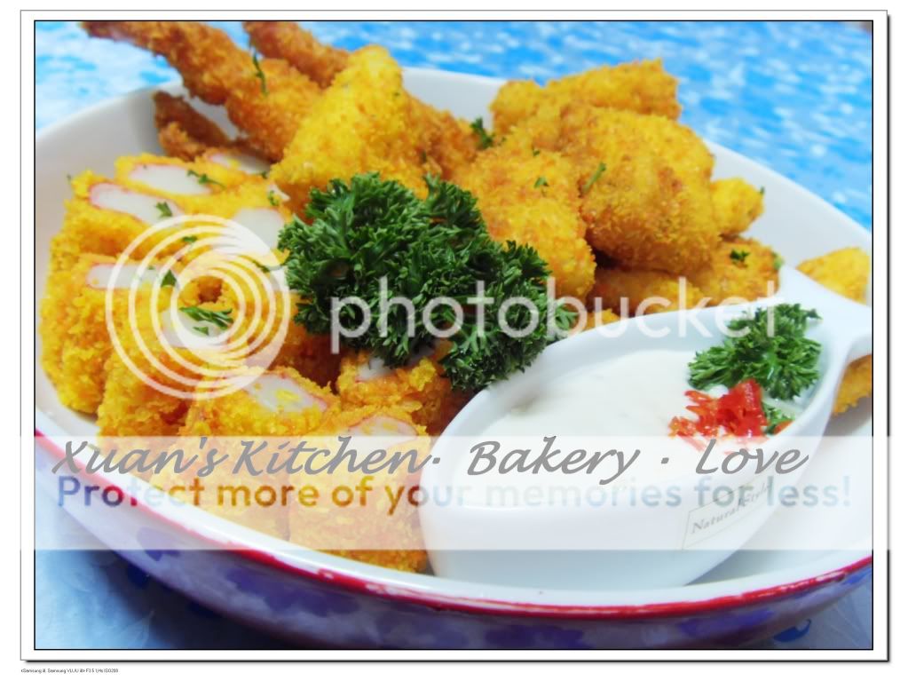 3鲜还是自己做比较好吃啊。。是用蟹柳,虾和dory鱼,把它们腌一点胡椒粉和盐,再过5关(平常是过3关,沾面粉,蛋和面包粉,但是要饱嘴一点和美一点,我就给它再过多2关) |