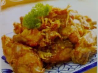 3)把鸡腿沾上粟粉 ,放进热油中炸至金黄色 .