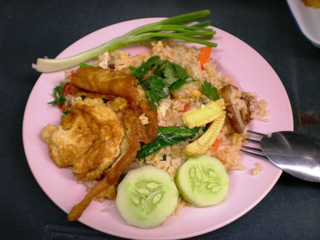 ***我的早餐 = 蛋炒饭+烧肉+附送一根葱 , 如果没记错的话, 应该是25Baht ***