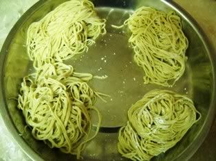 5。将面条用沸水中煮至面条熟,然后捞起,过冷水(我是直接开水龙头冲),再放入沸水煮一下,捞起
