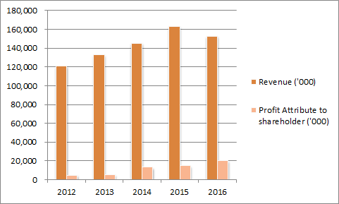 接下来看看毛利和净利率,上图一样明显可见两者都是处于uptrend。最新的2016年业绩同时也刷新最高记录,毛利率达到23%而净利率达到13%。这成绩算是及格了,平均RM 100的生意就有RM13入口袋了,看来这行的生意是蛮好做的XD