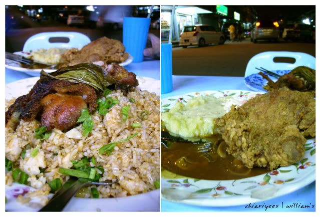 nasi goreng ayam pandan. chicken chop, 后面是mee raja ayam. |