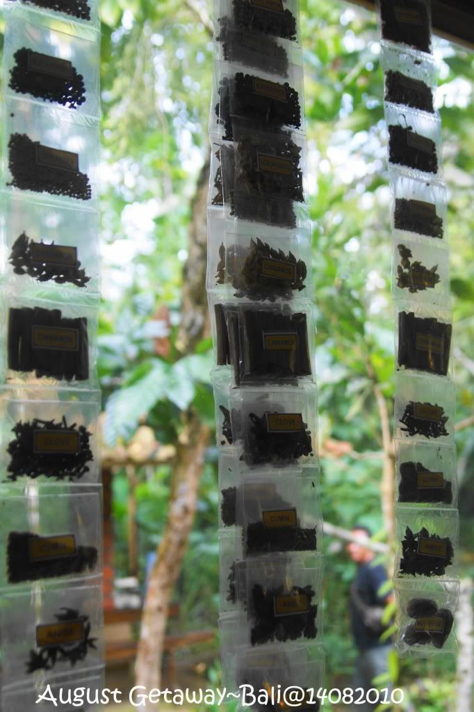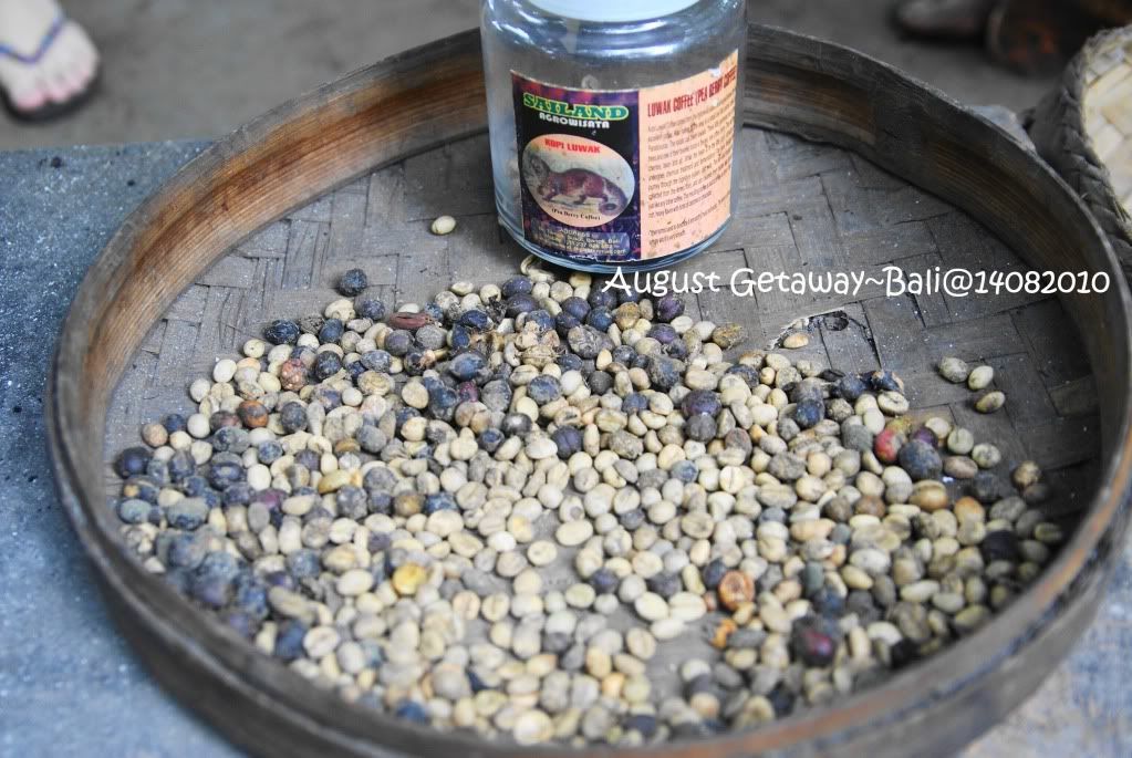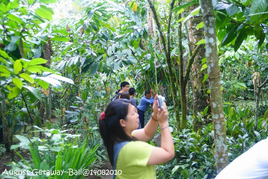 看回自己买的姜茶和香茅茶,那地方大概是叫Sailand Coffee Plantation 吧。入口处像是进入森林般,不满不知名的植物。一路走进,可以看见一些植物标上名字。我还是第一次看valina树。 Aunty正在炒咖啡,Uncle在磨粉。毫无吝啬的任由我们拍照,还让我们来试下炒咖啡的滋味。设立了几个亭子让游客试试他们的产品。可爱的小泥子忙着泡了五种不同味道的茶让我们试: Bali Coffee, “Balicino”, Lemon Grass, Ginger Tea,和Choco(不好意思, 最后那个我真的记不起那是什么了,