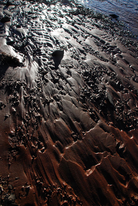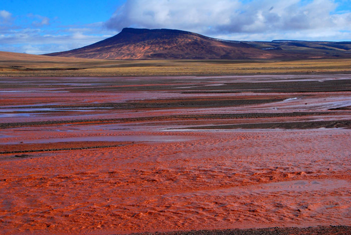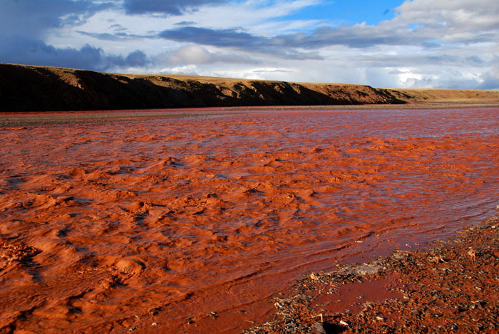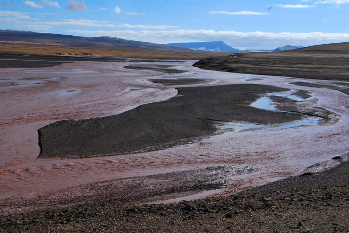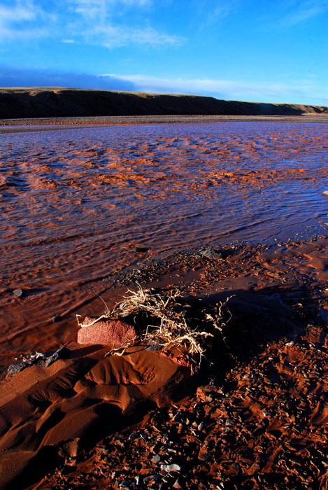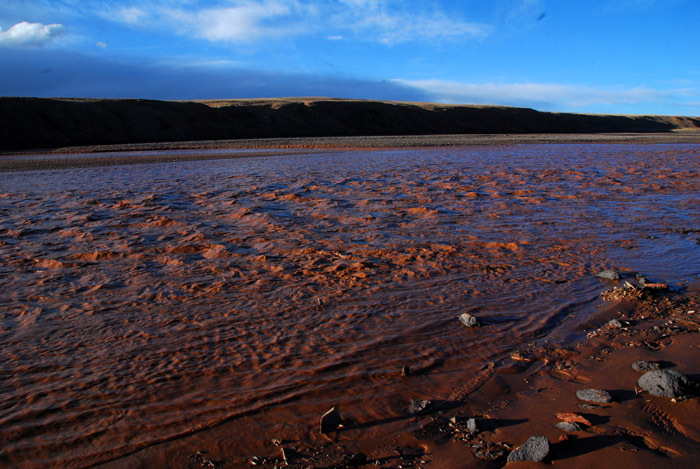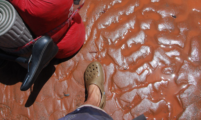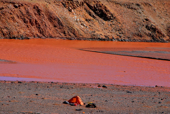 晨醒,听见帐外一片流水声,出来一看,大惊,昨天的窄道不复,扎营的滩涂被洪水围困,赶紧收拾装备推出水域。这个打击太意外了,河道在一夜间扩宽四倍,还险些把帐篷冲走。让晨水位低时过河的想法见鬼去吧。