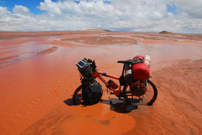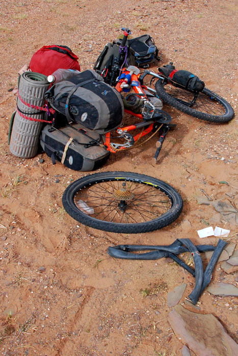 装上轮胎,没走多远,又漏气了……先前极度亢奋的心情再难寻觅,臆想着羌塘真要留人啊。之前的62天里就补过一次胎,两个裂口,而今天两个小时内补了四次胎,六个漏气点。这才刚开始,自行车轮胎正步入崩溃的边缘。