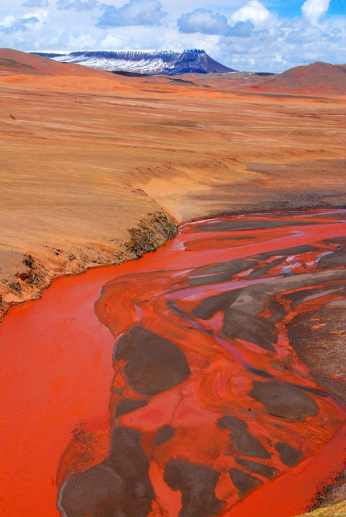 第一次下山,近七十度推下,很爽。用光脚探河,深度,河底面貌。探河又出现几个新问题,一是狭道里的水流更急,河水皆雪水融化很冷,急水如风寒效应放大了水的冷度,每次探河也就几分钟必须上岸暖脚。有过惨痛教训,某些淘金者过浅河,因脚冻麻无法站立,竟被过膝的水活活淹死。二是光脚在石砾河底无法发力,跟碎玻璃似的,这也是拖鞋非常重要的作用。三是“混凝土”,一旦陷到膝盖深就很难拔出来了,等着被冷水终结吧。《可可西里》中流沙是被艺术化的,可怕的是那种泥沙混合体,类似混凝土,轮胎陷20厘米就很难拔,更何况人。并未探到对岸,水至大腿基本就无法站稳,失温更快。尝试一次性推车过河,很冒险,豁出去,被水流冲翻,十来米,脚踩到硬底赶紧上岸,宣告失败。然后再七十度推上山,寻找下一个两山之间的窄道。