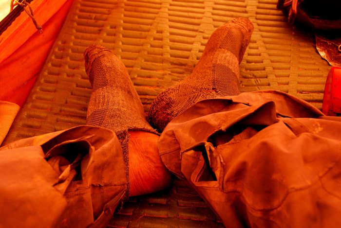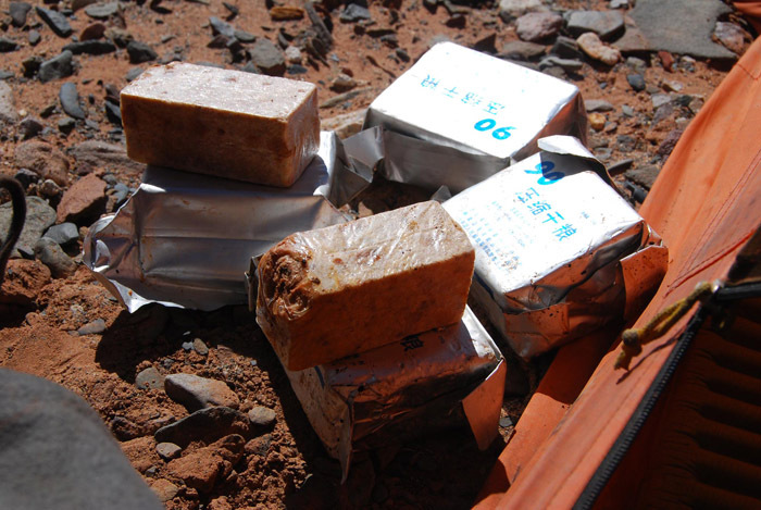 天气倒是很好,把驮包里湿透的东西拿出来晾晒,也是盘点。辣椒酱彻底没了,茶叶剩两小块,盐也剩一小把了,其余的紫菜什么的早就没了,(搞不明白,怎么一下子消耗这么快。)压缩饼干剩五包(2.5斤),可恨当天又吃掉两包。闲说这压缩饼干很有故事,2006年6月20号生产,保质期4年,意味着3天后饼干就过期了。先前就发现这个问题,找老板,他说阿里干燥,饼干没事,我也就没再纠缠。快过期,饼干确实没事,但结块严重,有些需要用铲子才能砸碎吃,有些漏气,稍许变味,总体来说,没出多大乱子。
