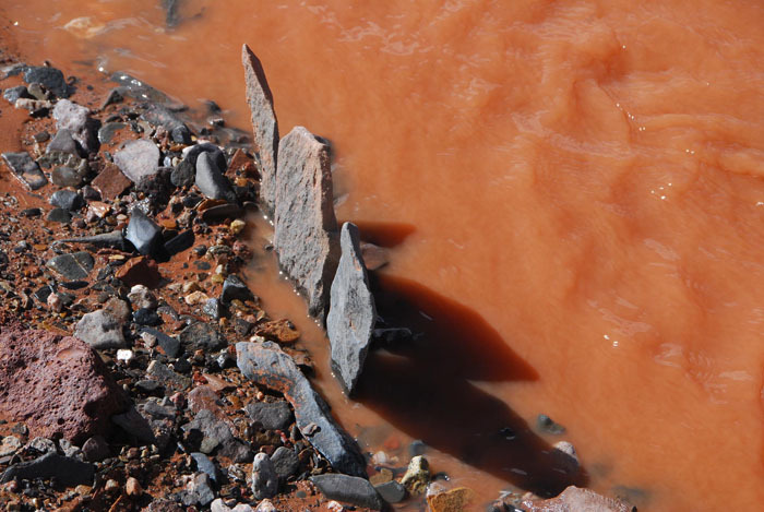 河道满溢,无法通行,只能推上山依河而行。山顶俯瞰河道一片红色血腥,传说中的正宗红泥河,想要过此河,首选要克服半米厚的淤积泥沙。当时,已经意识到途径错误,(地图和地貌都有误导),应该在河道左侧前行,所以一直寻找河道窄处过河(窄,水流大,淤泥少)。就像某个朋友看照片时说,水没有想象的大。高处俯瞰的视野的确容易迷惑人,我也因此从山上两下河道,皆有被骗之感。