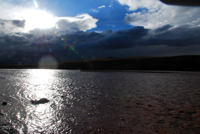河水一直未退,已不抱希望,这样的等,逐渐失去了意义。必须有所行动,不然真混吃等死了。有了几天的水文资料,虽然水一直在涨,但有其自身的小规律,就是下午5点钟左右是水位最低期。这似乎不符合逻辑,但事实大于臆测。中午开始在下游的一段河道里踩探,首先沿河每隔一米左右距离放块石头,目的是要确定河水中的位置,岸边石头就像经度,而维度靠相邻步数记录,确定河流硬底、水旋、沟槽、软泥的准确位置非常重要,光靠记忆是不行的,也是致命的。岸边再置一锚点,身系绳子,顺流斜切。到下午四点左右,终于像下跳棋似的到了对岸,极度狂兴奋,太不容易了。赶紧打包装备过河,这时发现自行车爆胎了,见鬼,这几天根本就没用过车。顾不得,先将驮包一一渡河,最后推自行车时还是被水冲翻,好在有惊无险。