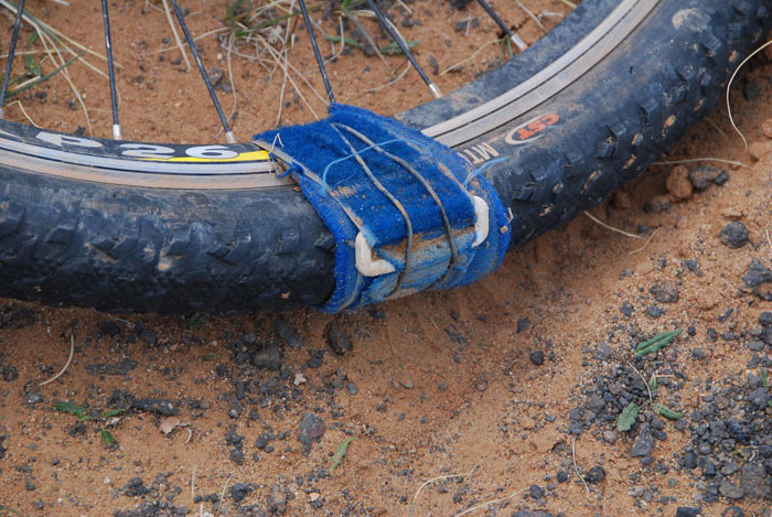 未先补胎,换上备用的,谁知走了不到百米又爆了。只好补胎,再查看外胎,发现触地的地方有一道四厘米的裂口,没带备用外胎(有点不可思议),只好用那副不曾用过的护腕加铁丝包扎外胎,勉强能用。