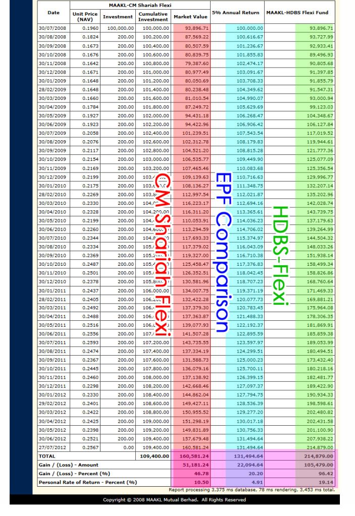 还有你和epf比也没用,要知道像当年我买基金的时候有那个基金佬不是拿着epf的回筹和我们说。说什么他们的基金只是投资马来西亚的股票的,没有外国的,还叫我放心。拿出10年的报告给我看,说他们平均可以拿到8%+的回筹。结果呢,经历了经济风暴后,股票从1300点掉到800点,再起回现在的1600点,但是我的基金到现在还在亏。而那个所谓基金经理却每天驾名车上班,吃好的喝辣的,他们(基金经理)就爽啦,我们投资的人就只有每个月拿着月结单在那里哭。