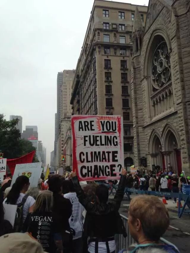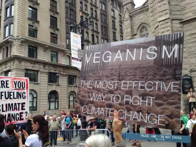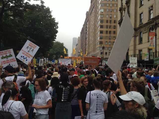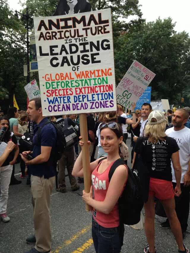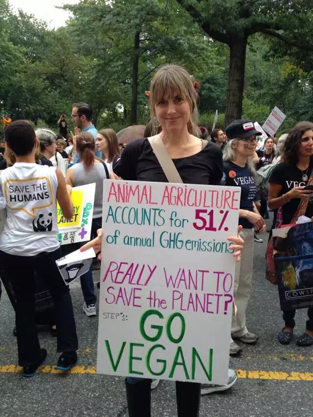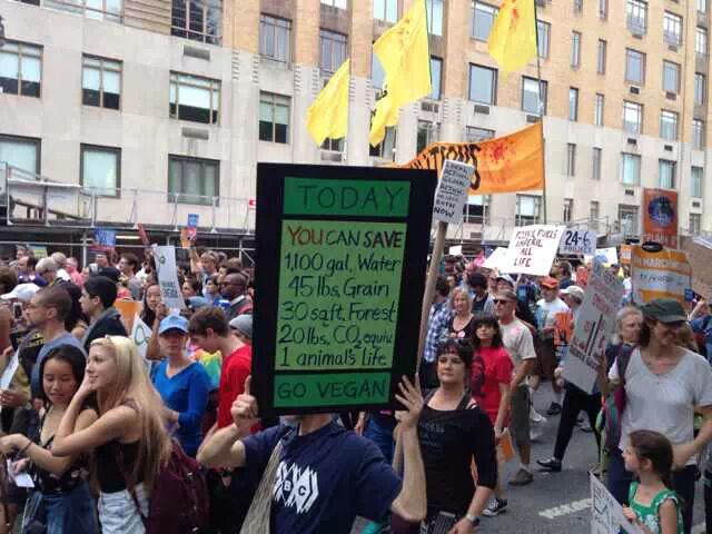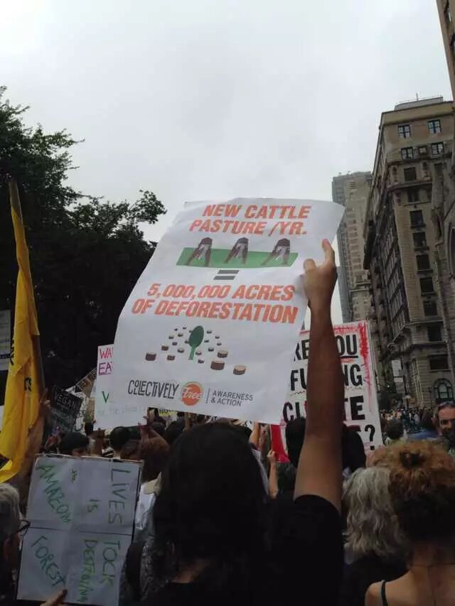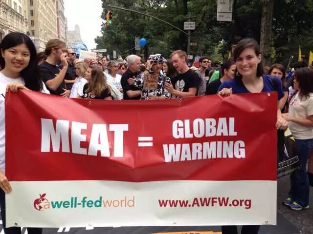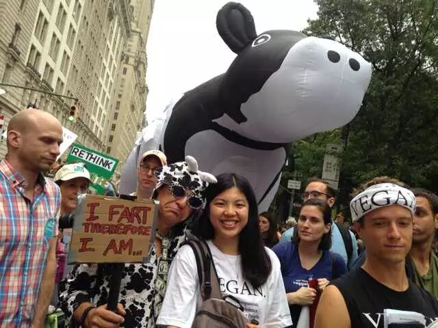 还在吃肉吗?你OUT啦! 当地时间9月21日,数十万民众在纽约展开大游行,敦促国际社会加紧应对气候变化。此次大游行是为9月23日召开的联合国气候变化峰会而举办的,获得了联合国和纽约市政府的支持,是史上最大规模的应对气候变化游行之一。 根据主办方最新数据统计,当天大游行的参与人数达到40万人,创下了历史纪录。此次游行有1500多个世界各地的组织共同组织参与,不同肤色、不同年龄、不同地域的人,为了一个共同的目标“对抗气候变化”而呼吁改变!此次游行的主要焦点是畜牧业和肉类消费对气候的影响。 纽约40万人大游行 呼吁人类吃素" title="素食风暴席卷全球 纽约40万人大游行 呼吁人类吃素" width="auto"> 在许多关注气候问题的环保人士共同努力下,9月20日晚,联合国大楼外墙当晚投影出图中的画面。“Livestockproduces more greenhouse gas than the entire transportationsector.” (畜牧业产生的温室气体比整个交通运输业还要多!)真让人振奋! 纽约40万人大游行 呼吁人类吃素" title="素食风暴席卷全球 纽约40万人大游行 呼吁人类吃素" width="auto"> 纽约40万人大游行 呼吁人类吃素" title="素食风暴席卷全球 纽约40万人大游行 呼吁人类吃素" width="auto"> 为了唤起各阶层的广泛关注,联合国秘书长潘基文(右一)、纽约市长白思豪(右二)、法国外长法比尤斯(左一)、美国前副总统戈尔(右三)、著名生物学家珍妮·古道尔(左二)等众多国际名流也参与到游行的队伍中。还有莱昂纳多·迪卡普里奥、爱德华·诺顿、马克·鲁法洛、斯汀等娱乐界明星加入游行队伍。 纽约40万人大游行 呼吁人类吃素" title="素食风暴席卷全球 纽约40万人大游行 呼吁人类吃素" width="auto"> 纽约40万人大游行 呼吁人类吃素" title="素食风暴席卷全球 纽约40万人大游行 呼吁人类吃素" width="auto"> 许多年轻人在游行,要求气候公平! 昨日,主页君Hazel也在纽约气候大游行现场,和数百名素食者一起游行,现在就与您分享激动人心的历史一刻。 此次,数百名素食者联合起来,打出了“我们拥有解决方案”的标语。向民众宣告:肉食是最不可持续的生活方式。而每个关注气候变化的人,可以做的最有力的改变就是,少吃肉!(尤其是红肉) 纽约40万人大游行 呼吁人类吃素" title="素食风暴席卷全球 纽约40万人大游行 呼吁人类吃素" width="auto"> 主页君前一日与关注气候政策的美国NGO组织BrighterGreen(记录中国肉类消费和环境问题的纪录片《何以为食》就是该组织制作的),以及美国、科威特、台湾、韩国的“无肉星期一”(MeatlessMonday)组织一起相约游行。图中的标语“肉食=全球变暖”来自AWell-fed World,一个致力于解决世界饥饿和气候问题的组织。 纽约40万人大游行 呼吁人类吃素" title="素食风暴席卷全球 纽约40万人大游行 呼吁人类吃素" width="auto"> 在现场,一个素食组织向素食者们免费发放素食T恤,也有许多素食者穿着自己的印有素食标语的T恤前来游行。素食者的队伍绵延两个街区,保守估计有超过500人。左侧有人拿着标语“吃一个汉堡=60天的洗澡用水!” 纽约40万人大游行 呼吁人类吃素" title="素食风暴席卷全球 纽约40万人大游行 呼吁人类吃素" width="auto"> 素食者队伍的最前方打着非常醒目的橘黄色条幅,上面写着“WeHave the Solutions"(我们有解决气候变化的方案!) 纽约40万人大游行 呼吁人类吃素" title="素食风暴席卷全球 纽约40万人大游行 呼吁人类吃素" width="auto"> 游行开始时,一只充气的大牛加入了素食者的游行队伍~环保素食者都知道,畜牧业排放的温室气体占世界总排放量的51% 纽约40万人大游行 呼吁人类吃素" title="素食风暴席卷全球 纽约40万人大游行 呼吁人类吃素" width="auto"> Everyone'sPlanet, Everyone'sProblem.地球是我们每一个人的,地球上的各种问题也是我们每一个人的。 纽约40万人大游行 呼吁人类吃素" title="素食风暴席卷全球 纽约40万人大游行 呼吁人类吃素" width="auto"> 畜牧业是地球头号污染源!重新思考农业! 纽约40万人大游行 呼吁人类吃素" title="素食风暴席卷全球 纽约40万人大游行 呼吁人类吃素" width="auto"> PETA(善待动物组织)此次打起了节约水的主题。“生产一加仑牛奶,需要1000加仑的H2O(水)”。“肉食是地球上消耗水资源最大的产业。” 纽约40万人大游行 呼吁人类吃素" title="素食风暴席卷全球 纽约40万人大游行 呼吁人类吃素" width="auto"> 吃一天素食,你可以拯救1100加仑水、45磅粮食、30平方英尺的森林、相当于20磅二氧化碳排放,以及一个动物的生命。 纽约40万人大游行 呼吁人类吃素" title="素食风暴席卷全球 纽约40万人大游行 呼吁人类吃素" width="auto"> 12:58分时,所有游行者举起手提示身后的人开始静默2分钟,2分钟后人群爆发热烈的欢呼声。游行的队伍绵延3公里,11:30游行队伍开始从中央公园西南角出发,但是因为人多,移动缓慢,位于13条街之后的我们2个小时以后(13:30分)才开始行进,据说队伍的尾巴到14:00才开始走。 纽约40万人大游行 呼吁人类吃素" title="素食风暴席卷全球 纽约40万人大游行 呼吁人类吃素" width="auto"> 等待的过程种,看到一位游行者身后的标语“Don'tKeep Calm, get active and change theworld”(不要冷静,行动起来,改变世界!) 纽约40万人大游行 呼吁人类吃素" title="素食风暴席卷全球 纽约40万人大游行 呼吁人类吃素" width="auto"> [size=+0]BrighterGreen的工作人员Caroline举起标语“忍受不了天热了吗?少